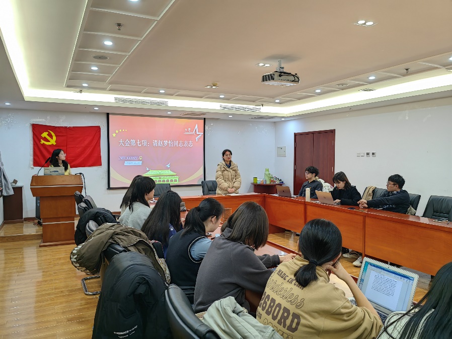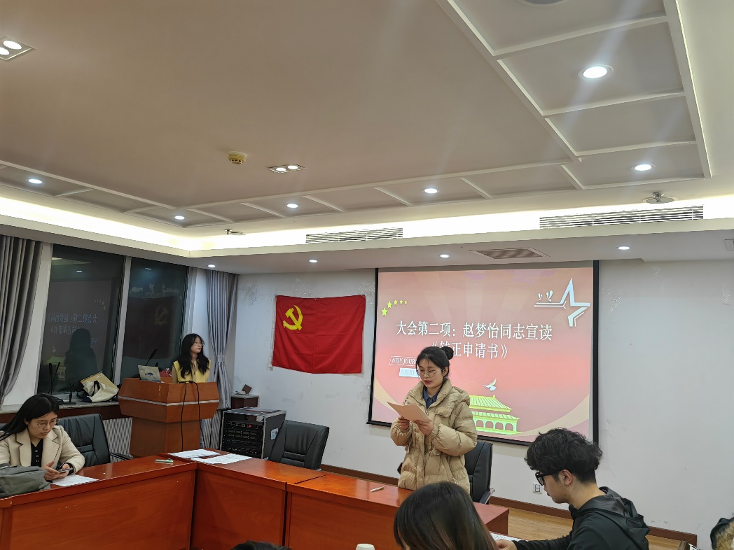 首先,预备党员赵梦怡同志宣读转正申请书,从思想、学习、生活等方面汇报了自己在预备期的表现、对党的认识、入党动机等,表达了入党的志愿与决心。支部书记徐晓枫同志代表支委会向大会介绍了申请人在预备期间的工作表现和教育考察意见等情况,认定其符合正式党员的要求,同意按期转正。入党介绍人水添辰同志向大会介绍赵梦怡同志的基本情况,并就申请人在预备期间的表现,表明同意其按期转为正式党员的意见。