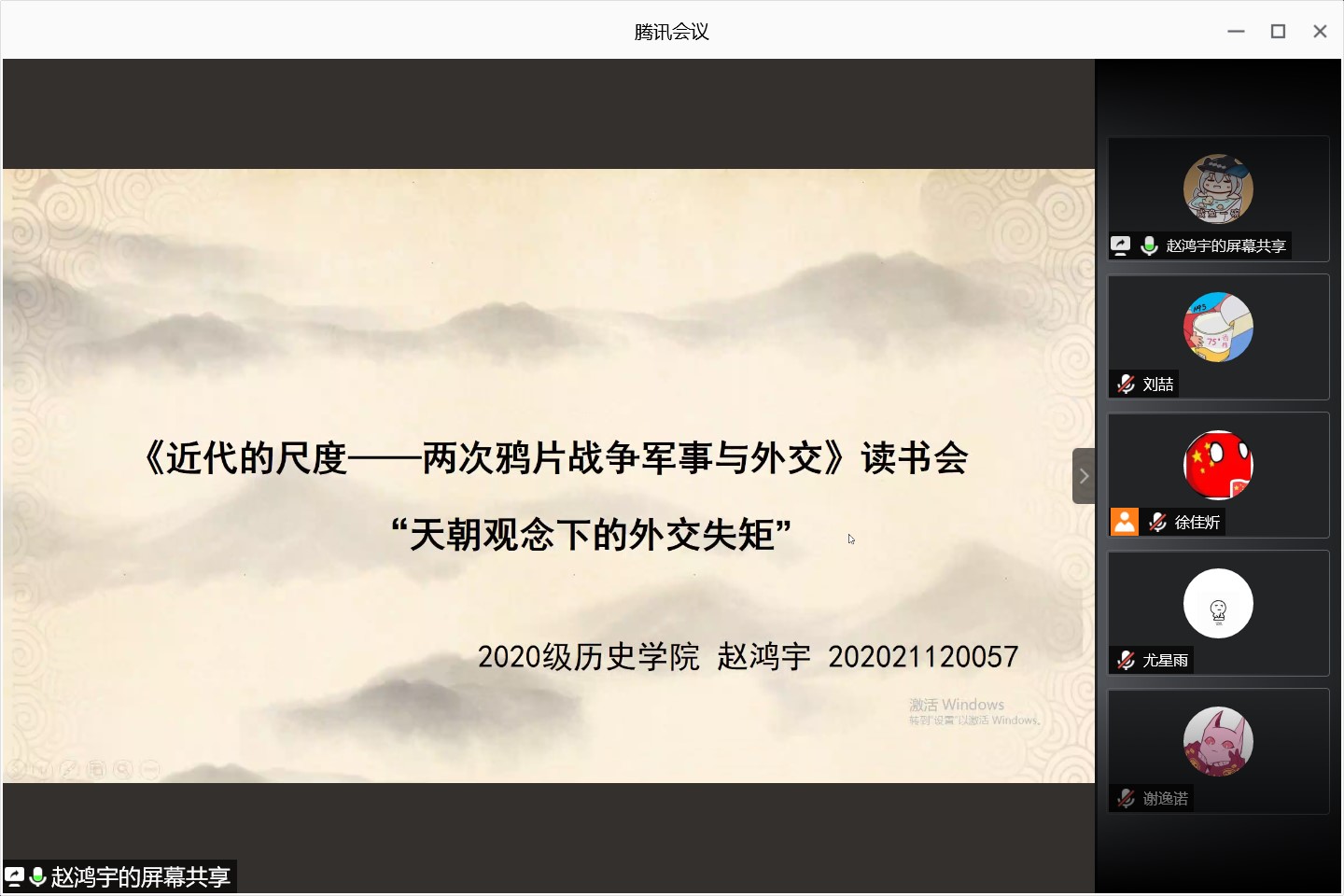 2020年10月24日19:00,春秋学社举办了《近代的尺度:两次鸦片战争军事与外交》(以下简称《近代的尺度》)第二部分“天朝观念下的外交失矩”读书会。本次读书会有幸邀请到新爱体育(官网)官方网站2020级硕士生赵鸿宇同学导读。会议由春秋学社常务副社长杨晓锐同学主持。
