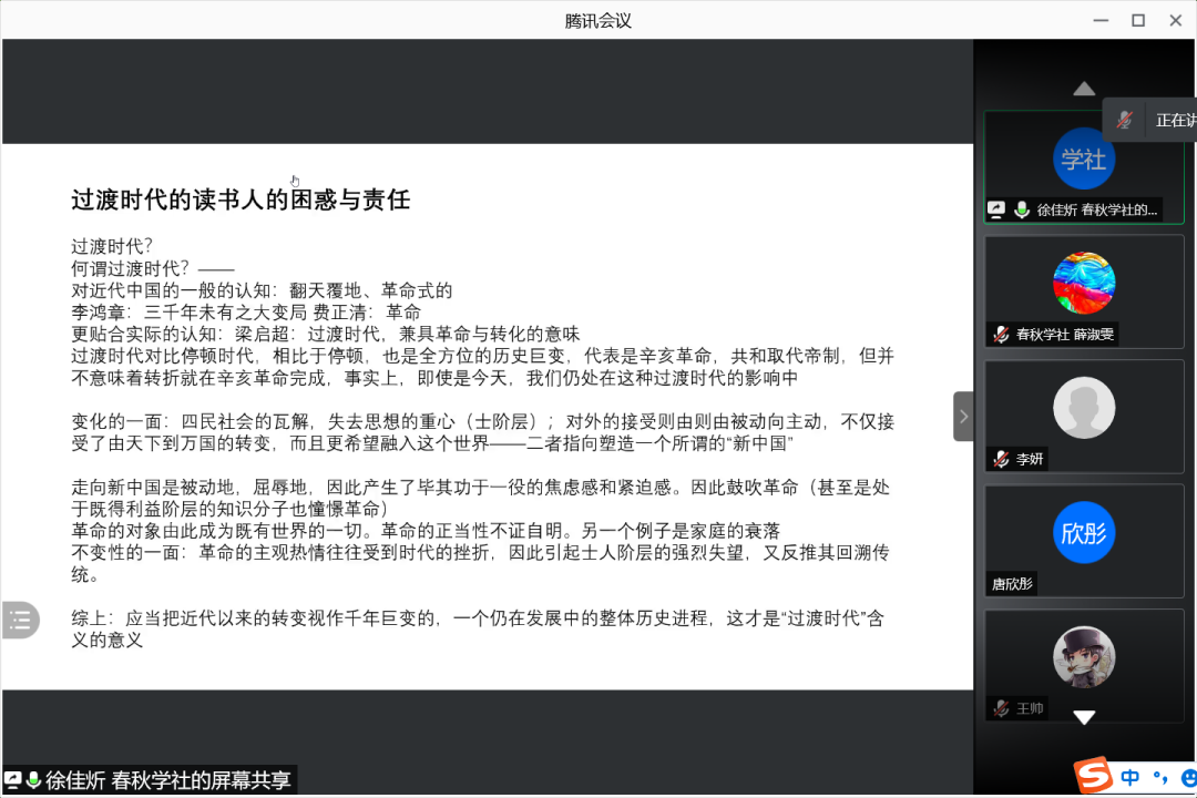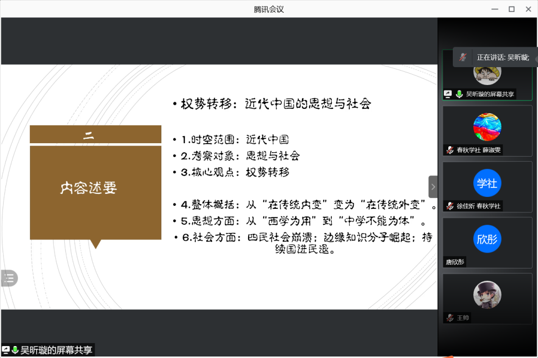 5月2日晚七点,春秋学社举办了《权势转移:近代中国的思想与社会》(以下简称《权势转移》)第二次线上分享会。本次分享会有幸邀请到新爱体育(官网)官方网站2019级硕士生吴昕璇同学作为导读嘉宾。会议由春秋学社企划部吴蕾同学主持。