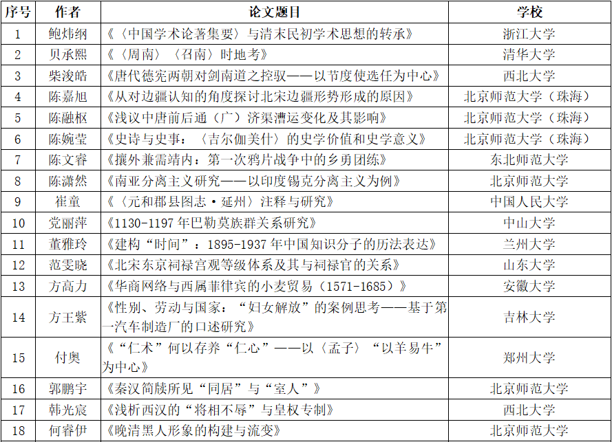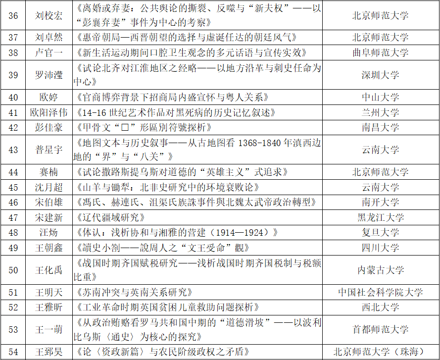 自2020年9月7日春秋学社微信公众号“学问60秒”发布征稿通知以来,论坛组委会共收到来自北京师范大学、北京大学、清华大学、中国人民大学、中国社会科学院大学、南开大学、复旦大学、浙江大学、武汉大学、中山大学等全国63所高校在读本科生投递的226篇有效稿件。经相关专家双向匿名严格评审,组委会从中遴选出70篇优秀作品。现将入围名单公示如下(以姓名拼音为序):