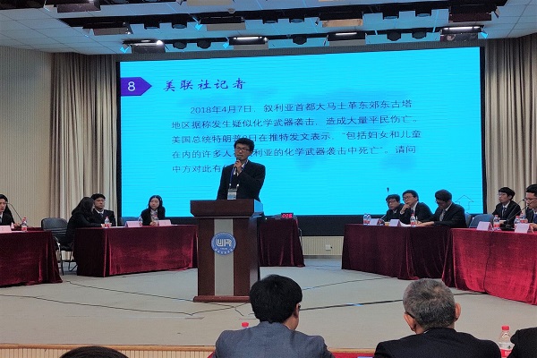 在判断正误题环节中,我校选手邵楠同学从容应对,初战告捷;在描述猜词题环节中,我校代表队成员“心有灵犀”,淡定自如,陈楠峰同学充分调动自身知识储备辅以机智提示,准确生动地描述词条,邵楠同学同样敏捷判断,继续保持着优势。在模拟新闻发言人环节中,我校选手梁炜晗同学压轴上场,应对“美联社记者”针对叙利亚“化武疑云”的提问,立场坚定,语言流畅,礼仪得体,充分展示外交风采;在决胜环节——“人生世事一场梦”中,我校代表队在答对前两道题后,选择继续挑战难度最大的最后一题,虽遗憾未能圆满答对,但他们勇于挑战的精神仍获得了全场观众的赞许。最终,经过与各高校代表队的激烈争锋,代表队成员凭借1777分的高分荣获亚军。