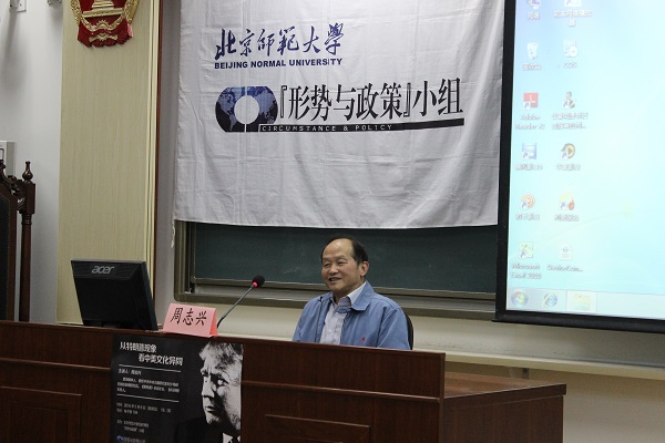 5月6日晚,由资深媒体人、共识网负责人周志兴老师主讲的“从‘特朗普’现象看中美文化异同”专题讲座在电子楼104举行。本次讲座为我院“形势与政策”小组第七十八次集体学习,并对外开放,吸引了众多来自我校和首都社会机构的师生及青年代表。