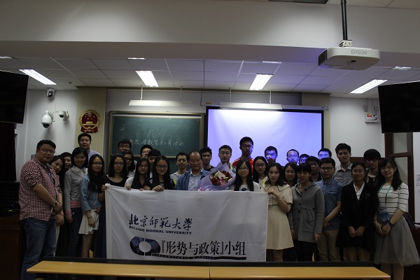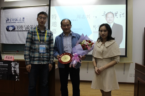 讲座在热烈的掌声中落下了帷幕,“形势与政策”小组组长张俊毅同学向周志兴老师赠送了北京师范大学特色纪念品。
