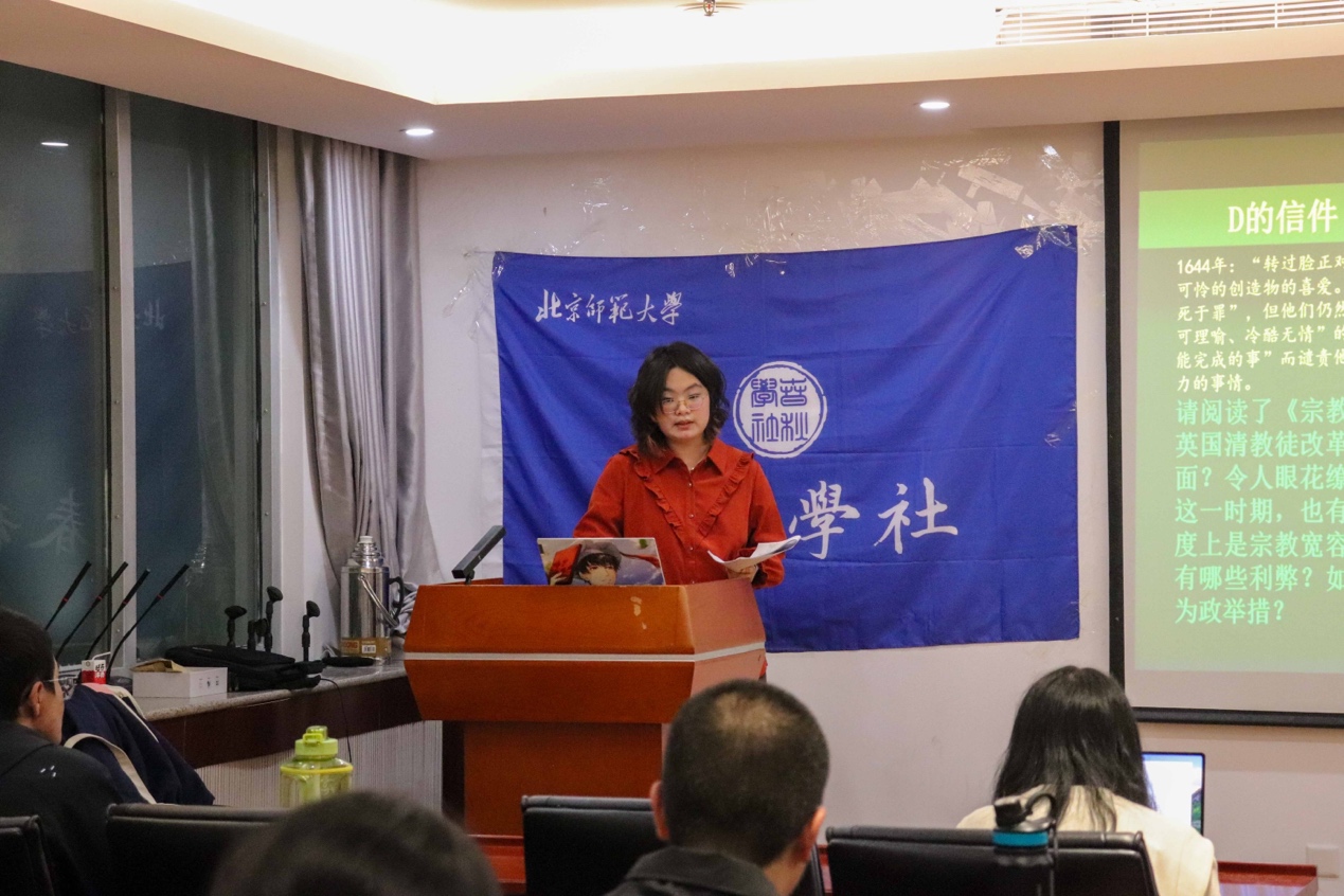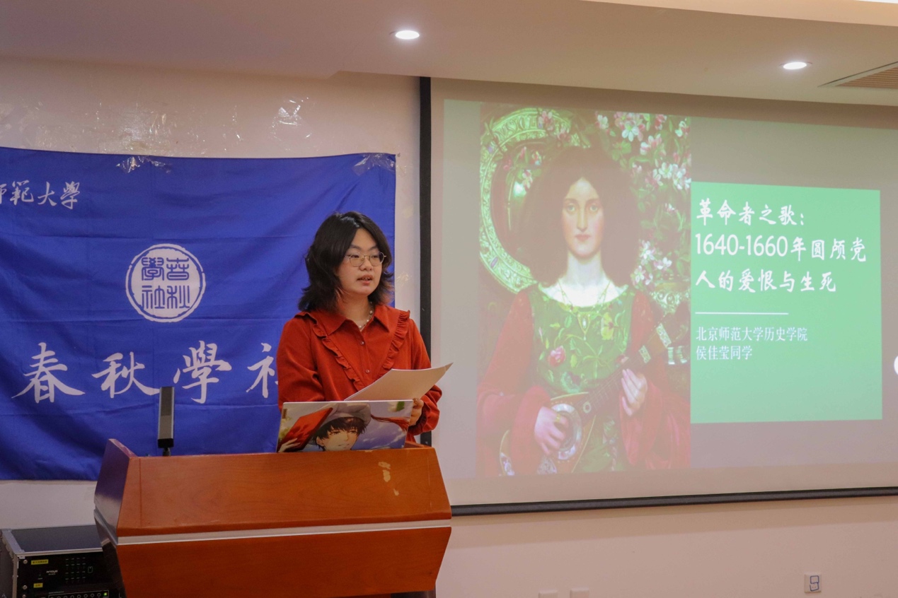 10月12日晚7时,春秋学社在主楼600室举办了“革命者之歌:1640—1660年圆颅党人的爱恨与生死”世界史读书会。本次读书会邀请到了历史学院2024级硕士研究生侯佳莹同学担任主讲嘉宾。会议由春秋学社申海洋同学主持。