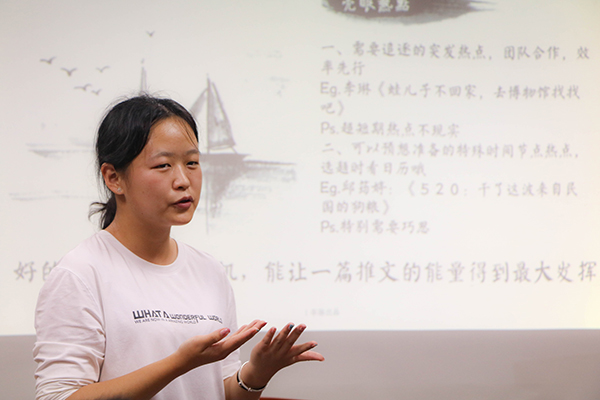 为了让社员更好地了解《春秋人文报》报纸版面以及线上的推送工作,文编副主编王雨璇、新媒体运营中心主任李琳详细地介绍了工作内容。春秋人文报社部分2018级社员参加了此次培训。