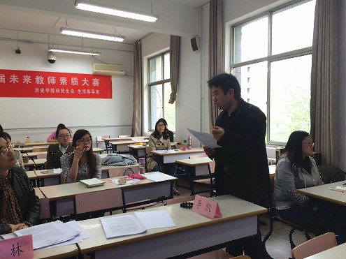 本次比赛分为两个分赛场同时进行,每个赛场有三位评委、八名选手,每位选手进行十分钟的试讲,最后根据评委的打分各取5名选手进入决赛。虽然只是短暂的十分钟,选手们准备的内容却是非常详实,小农经济、解放战争、洋务运动、新航路的开辟、美国联邦政府的建立、新中国初期的外交、戊戌变法、罗斯福新政、古代希腊民主政治、英国君主立宪制的建立、从计划经济到市场经济、文艺复兴巨匠、古罗马的政治与法律等等。各位选手经过精细的准备,或运用多媒体,或与学生互动,或引经据典,都各具特色地将课程以最生动的形式展现在大家面前,赢得在场老师、同学的阵阵掌声。