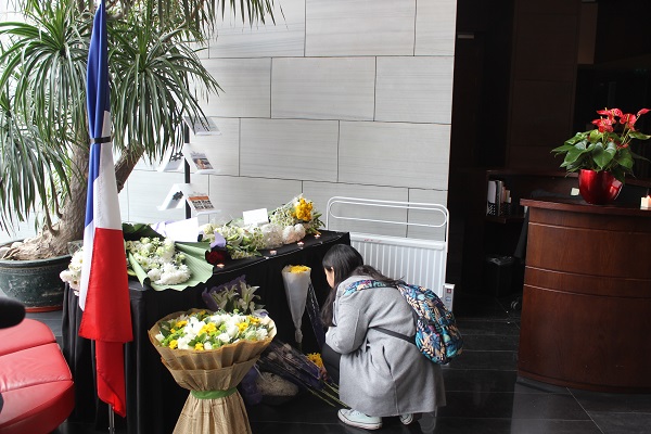法国当地时间13日晚,巴黎发生多起恐怖袭击事件,许多无辜的普通民众在此次恐怖袭击中丧生。次日上午,我院本科生代表十余人前往法兰西共和国驻华使馆,吊唁巴黎系列恐怖袭击遇难者。我院“形势与政策”小组常务副组长王帅捷、副组长兼外联专员王聿闻、学研顾问陈鸣悦等参加了吊唁活动。