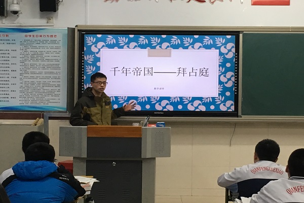 然后胡德旺在高二的一个班级以“千年帝国——拜占庭”为主题给同学们上了一节精彩的历史兴趣课。拜占庭帝国的历史在高中课本里面作为中世纪历史的一部分被一笔带过,长期以来没有得到人们的重视。通过展示这个帝国辉煌灿烂的历史,丰富了同学们的历史知识,增加了他们获取新知识的兴趣。胡德旺首先从服饰、马赛克画和建筑三方面以图像的形式向同学们形象地展示了拜占庭绚丽多彩的历史文化,然后围绕君士坦丁、狄奥多西一世和查士丁尼三位皇帝讲述了拜占庭早期的历史。课堂上同学们兴趣很高,听得非常认真,取得了良好的效果。