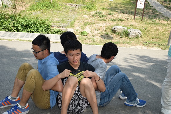 到达后,稍事休息,大家开始了第一个素质拓展——一元两元。男生代表两元而女生代表一元。大家在广场上围成一个圈,随着音乐转圈,当音乐停止后,主持人报出一个数字,所有人要在10秒钟内自由组队凑齐该数字。在这个活动进展的过程中,大家都由一开始的羞涩慢慢地放开,每个人都很关心自己与同伴组成的小组凑成的数字,凑不齐时疯狂的拉人。最后把所有人都分成了两组。整个活动只有短短的六分钟,但是大家像是相处了很久一样,打破了隔阂。