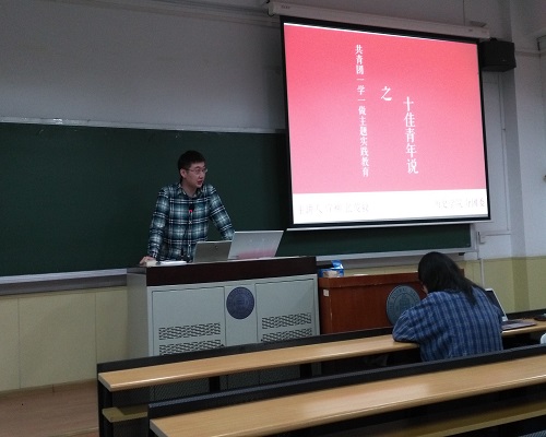 历史学院青年团校本学期首次团课“十佳青年说”于2017年4月16日晚8:00在艺术楼201教室顺利举办。本次团课由荣获“北京师范大学十佳大学生”称号的张俊毅同学和宣柳同学主讲,历史学院青年团校全体学员参加了此次团课。