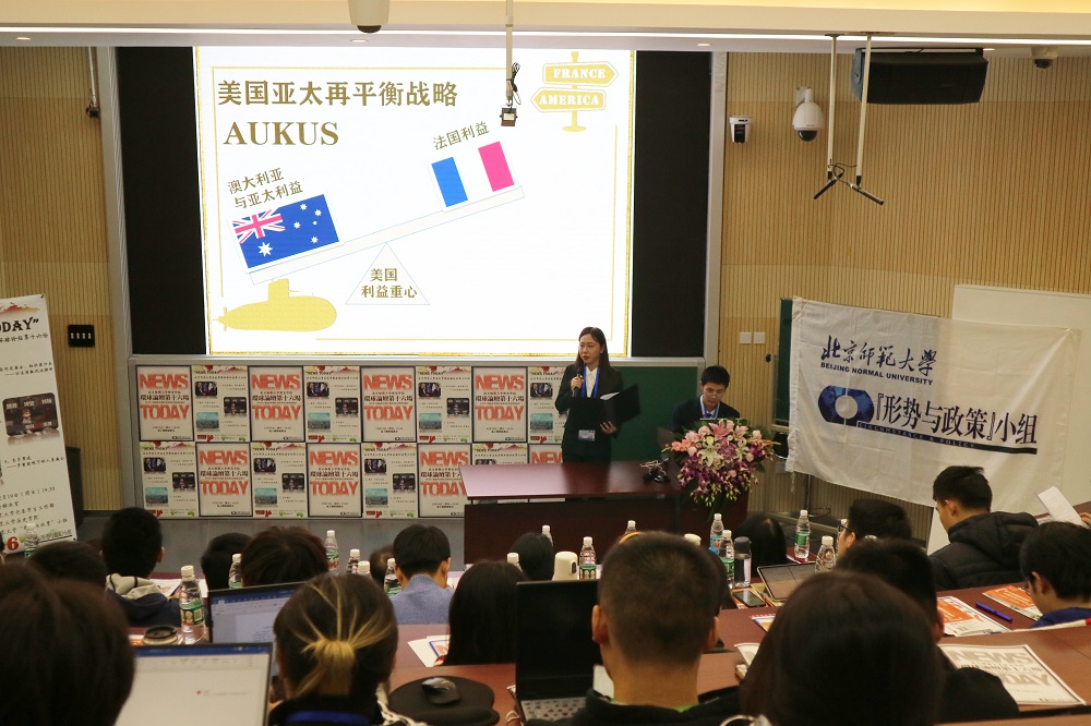 活动中,“形势与政策”小组2021级新成员分为三组,围绕法美潜艇风波、波兰与白俄罗斯边境的难民危机、东京奥运会等国际热点话题,结合历史与现实进行主题展示。