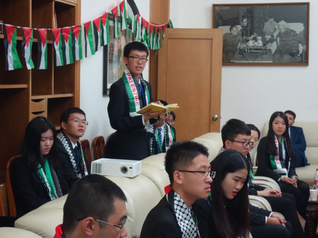 巴勒斯坦国驻华大使法里兹·马赫达维、参赞山地(Shadi Abuzarqa)、一等秘书阿姆贾德•阿布希(Amjad Abuhit)、一等秘书阿姆贾德·哈马亚瑟(Aamjad Khamayseh)、二等秘书萨拉赫·谢哈布(Salah Shehab)、二等秘书穆罕默德•瓦义乐(Mohamad Wael Hamidah)、三等秘书哈桑·泰斐西(Hassan Tafish)等巴方高级官员亲临现场。“形势与政策”小组组长秦雅婕,宣传顾问陈子梁,副组长孟子煜、陈力文、张雪妍等出席活动。一同参加活动的还有清华大学、北京理工大学、中国政法大学等五所首都高校的学生代表。