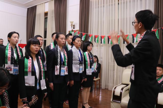中国和巴勒斯坦有着相似的历史。“形势与政策”小组成员献上一首《七子之歌-澳门》,唱出了两国人民在屈辱时代的抗争以及对和平独立的渴望。为了进一步解决同学们学习过程中的疑惑,马赫达维大使还对同学们的提问作了细致的解答。“我带着橄榄枝和自由战士的枪来到这里,请不要让橄榄枝从我手中滑落。”小组成员引用阿拉法特名言询问巴勒斯坦对美国退出后中东局势的看法。马赫达维大使指出,巴勒斯坦人民热爱和平,巴勒斯坦地区的事务应由当地人民自己决定,也期待中国在中东和平进程中一如既往发挥建设性作用。