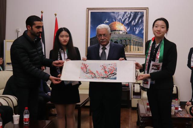 活动期间,“形势与政策”小组与巴勒斯坦使馆互赠纪念品。小组赠送的梅花锦帛画卷代表中国传统文化中梅花高洁傲岸的寓意,象征着中巴两国在艰苦时期仍毅然坚守的民族气节。