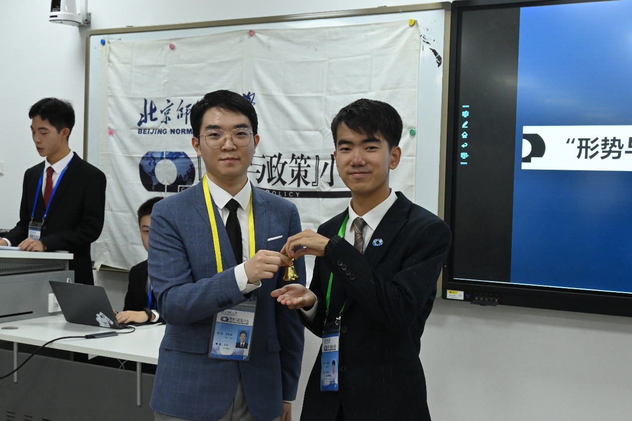 在7月16日举行的选举会上,第十五届“形势与政策”小组副组长兼学研专员李远哲当选为第十六届小组组长。经过前期选拔,11位同学组成“形势与政策”小组第十六届领导团队(名单附后)。安然老师宣读了名单,并为第十六届领导团队成员逐一授予胸牌。李远哲从许宸睿手中接过象征小组智慧和希望薪火相传的金色铃铛,标志着第十六届领导团队正式就职。