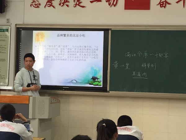 2014级硕士生一支部党员赵粲然代表所在小组为高二(3)班的同学作了题为《从老字号看老北京的饮食文化》的主题讲座,他从北京餐饮老字号导入,分别介绍了北京宫廷菜、官府菜、民族特色的饮食和民间饮食,并结合清代至民国的历史背景向同学们讲述了老北京不同饮食文化的变迁与融合。讲座活泼生动,吸引了同学们对于北京饮食文化和近现代北京历史的兴趣。