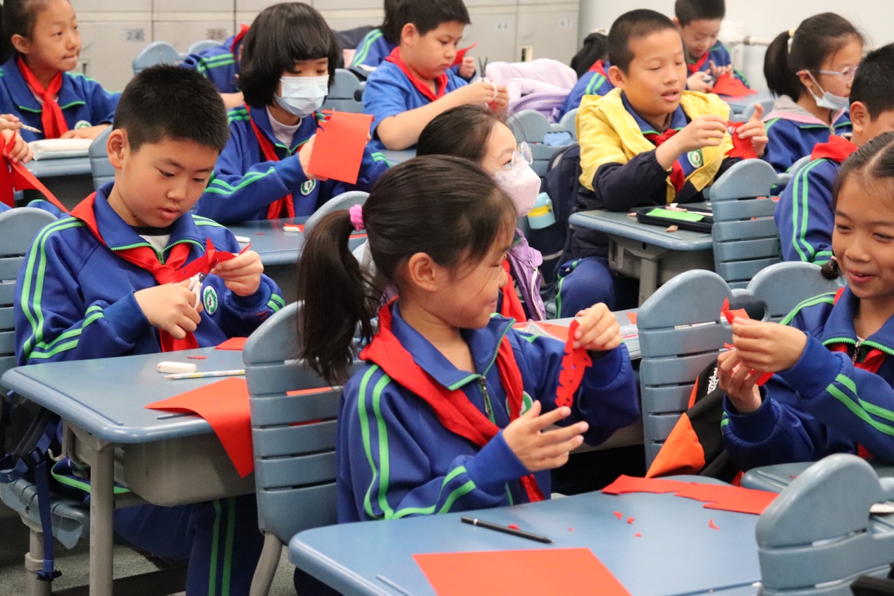 王晓茜、王若涵同学向三(1)班简要介绍了位于中国四大传统节日之首的“春节”。他们从“年兽”的古老传说切入,通过演示“年”字从古到今的演变,带领同学领略这一传统佳节形成与发展的历史。在众多“过年”的习俗中,有一项延续至今的指尖艺术——剪纸。“叶逐金刀出,花随玉指新”,一张红纸一把剪刀就能剪出千姿万态,其中每一个图案都藏着一个“吉祥密码”。每一个“密码”背后都寄托着古今人民对于“新年”的美好愿景和对于幸福生活的殷切期盼。学社成员们对剪纸的细致讲解,让同学们感受到了剪纸文化的深厚历史底蕴和独特艺术魅力。