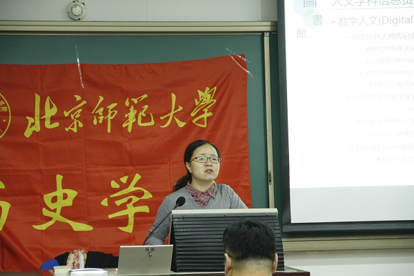 首先,仝卫敏老师指出了当今人文学科信息资源发展的新趋势,简单做了中文、外文、商业三个方面的数字人文项目推介,并以中国历代人物传记资料库为例,说明数字人文对学术研究带来的挑战。接下来,仝老师简单介绍了学校图书馆的概况,包括新旧馆的建立时间、资源概况、楼层分布、网站主页等。她提出要格外注意主馆南区三层、教育学分馆、历史学资料室的一些文献资料。紧接着,仝老师着重介绍了“木铎搜索”的使用方式。