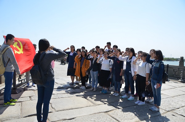 5月6日早10点,支部成员到达卢沟桥。在自由参观之后,大家面向党旗,在支部书记孟蕾同志的带领下重温入党誓词,引来众多路人驻足观看。脚下是崎岖不平的桥面,昨日的苦难历史仍历历在目,支部成员铿锵有力的宣誓,展现了新时代青年不忘历史、勇担时代使命的精神风貌,更激励同志们不忘初心、砥砺前行。