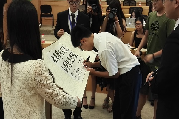 7月20日,2015两岸青年主题论坛在清华大学五道口金融学院景林报告厅正式开幕,中国工程院院士钱易教授、共青团清华大学委员会副书记齐兴达、清华大学港澳台办公室主任杨庆梅等多位嘉宾与来自两岸的学生社团代表一同参加了论坛开幕活动。清华大学学生海峡两岸交流协会会长谢孟希和杨庆梅主任以及齐兴达副书记分别做了开幕致辞,钱易教授围绕“绿色经济与永续发展”进行了主题讲座。钱教授从人类面临的环境问题出发,讨论了人类可持续发展的实质,阐释了环境伦理观的含义,并在生态文明建设方面提出了生态工业园区、可持续生活模式、城市水资源管理新战略等思路。在开幕式中还举行了“两岸学生交流社团发展联盟”成立仪式,发表了“两岸学生交流社团发展联盟”成立宣言,来自两岸9个社团的学生代表在已写有“两岸学生交流社团发展联盟”的卷轴上进行签字并合影留念。
