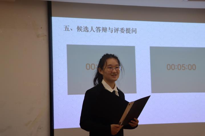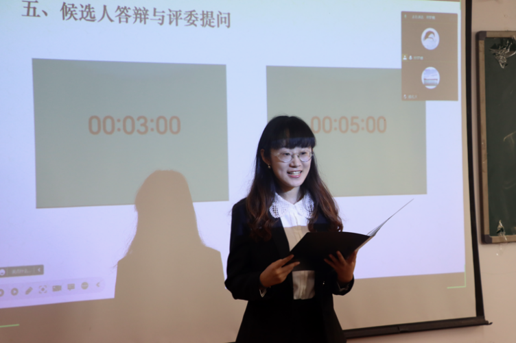 随后,评审会议正式开始。在现场答辩环节中,每位候选人均用心准备了PPT和发言稿,他们自信大方、条理清晰,通过对自身在校学习、思想情况、社会实践、创新创业等方面的展示,向评委和在场同学们介绍自己在过去一学年中所参加的各种活动项目与志愿服务,以及自己在活动中取得的荣誉。他们用优异的成绩和奖项诠释了“德、智、体、美、劳”全面发展的重要意义,充分展现了历史学院学子在专业能力和综合素质上的实力和能力。