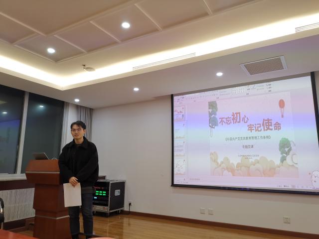 本次会议是党员同志与积极分子共同参加的第一次正式会议,每位同志先进行了简短的自我介绍,便于日常的培养和联络。党支书彭紫荆同志带领全体同志共同学习了《中国共产党党员教育管理工作条例》。彭紫荆同志介绍了本条例制定的背景,强调了制定条例所遵循的原则,并且对“学习贯彻习近平新时代中国特色社会主义思想”、“党员教育基本任务”、“党员日常教育管理主要方式”等章节的内容进行了具体的分析。总体学习后,党支书还通过答题方式检验、巩固了各位同志的学习成果。此外,党支书向各位非正式党员以及正式党员系统介绍了发展党员工作的五个环节以及二十五个工作流程。