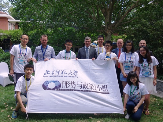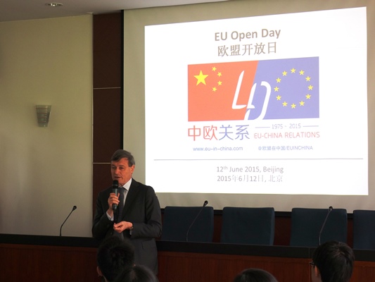 2015年6月12日,应欧洲联盟驻华代表团邀请,我院学生作为首都高校学生代表赴欧洲联盟驻华代表团参观交流,参加“纪念中欧建交40周年招待会暨2015年使馆开放日”活动,并与欧盟驻华大使史伟(Hans DietmarSchweisgut)先生进行了亲切交谈。我院“形势与政策”小组原组长宋文经、学研顾问陈鸣悦、外联专员王帅捷、郑子薇、副秘书长彭代琪格等参加了活动。一同参加此次活动的还有来自外交学院和北京外国语大学等高校的学生代表。