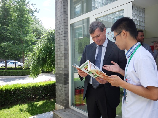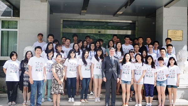 上午10时许,同学们抵达欧盟驻华代表团,欧洲联盟驻华代表团大使史伟先生和代表团工作人员向大家表示了热烈的欢迎。史伟大使与同学们在使馆正厅前拍照留念,并代表使馆向同学们赠送了欧盟文化衫、欧盟知识地图等纪念礼物。