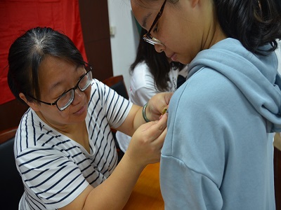 会议在庄严的共青团团歌中拉开序幕。会议开始,首先由本科生团总支书记田苗苗对此次招新工作进行了初步总结,提到了招新过程中18级新生们积极参与学生工作的热情和分团委此次招新工作的丰硕成果,强调了新媒体公众号平台在招新过程中发挥的作用,并宣读了第39届分团委团干事名单。随后,由分团委书记胡小溪老师、副书记邢海和宿雅婷以及本科生团总支书记田苗苗为新生团干事佩戴团徽并合影留念,以镜头定格下这具有纪念性意义的一刻。在会议的最后,胡小溪老师发表了讲话,提出新一届团干事不仅要完成身份的跨越,更要完成角色的转变,通过执着的精神与事业心来证明自己的优秀,在团学工作中收获成长。