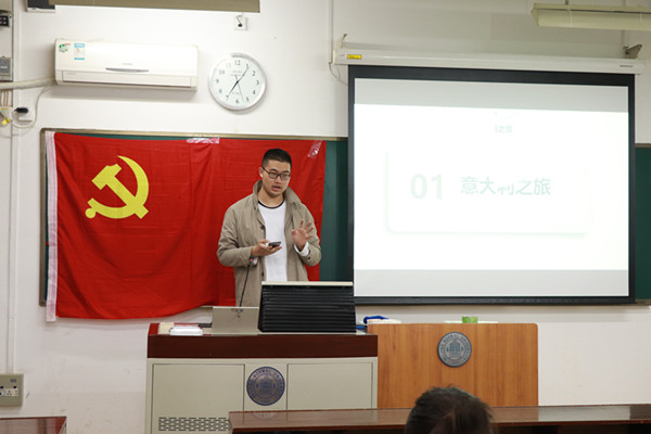 刘泽元同学代表第一大组分享小组学习的内容,其围绕“习近平访欧”的主题,通过介绍习近平总书记的意大利之旅、摩纳哥之旅、法国之旅,反映出我国促进合作、反对单边主义和孤立主义的决心。