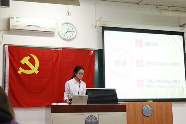 艾烨同学代表第二大组就“习近平的生态思想”进行小组展示。第二大组的同学们分析了习近平总书记生态思想的理论来源,并且结合习近平总书记的具体实践活动对其思想的成熟化进行了总结,最后,其以全国生态环境保护大会为基点,系统阐述习近平总书记生态思想六个原则、五个体系等重要内容。