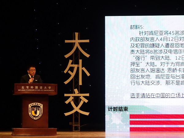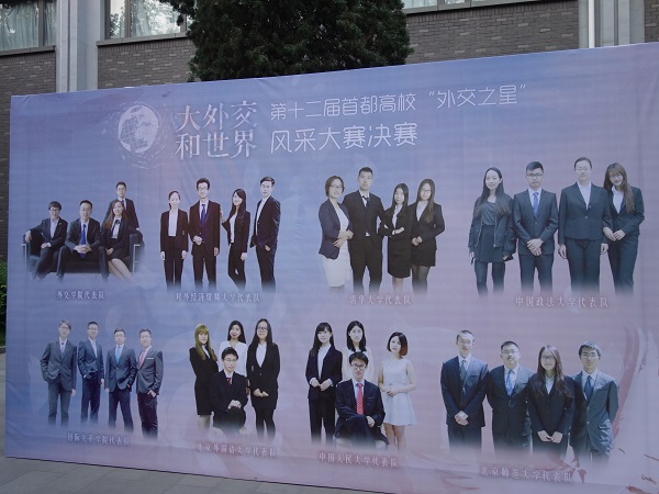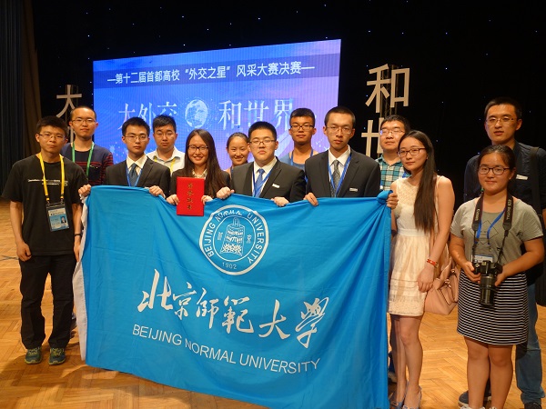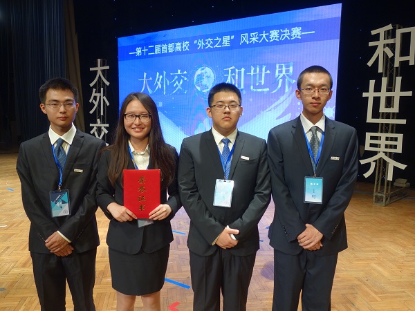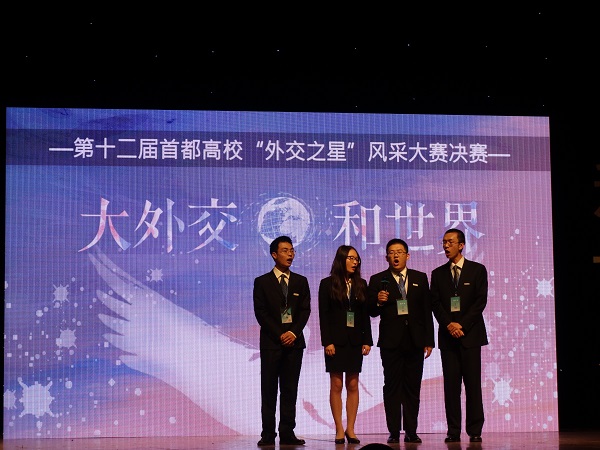 当晚,第十二届“大外交·和世界”首都高校外交之星风采大赛在北京外国语大学千人礼堂成功举行,来自清华大学、中国人民大学、北京师范大学、北京外国语大学、国际关系学院、对外经济贸易大学、外交学院等首都高校的八支代表队参加比赛,展开了激烈角逐。最终,由我校文学院2013级本科生贺天行、教育学部2015级本科生赵文博、哲学学院2015级本科生徐子钧和我院2015级本科生刘畅组成的北京师范大学代表队荣获比赛亚军。