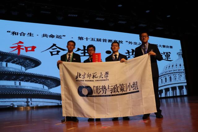 2019年5月11日晚,第十五届“和合生·共命运”首都高校外交之星风采大赛于北京外国语大学举办。我校历史学院2016级本科生高超、法学院2017级本科生孟子煜、历史学院2018级本科生邢晓坤、历史学院2018级本科生李才林应邀参加比赛,荣获季军。“形势与政策”小组组长秦雅婕、秘书长陈雁、副组长兼组织专员陈力文、外联专员庞雨婕、宣传专员胡潇予等应邀前往观赛。