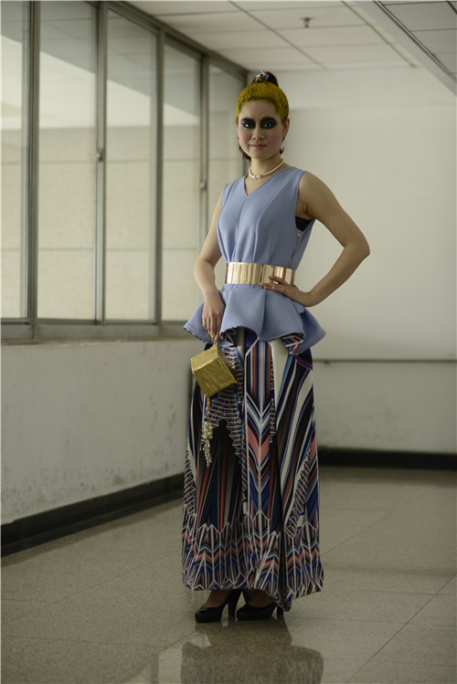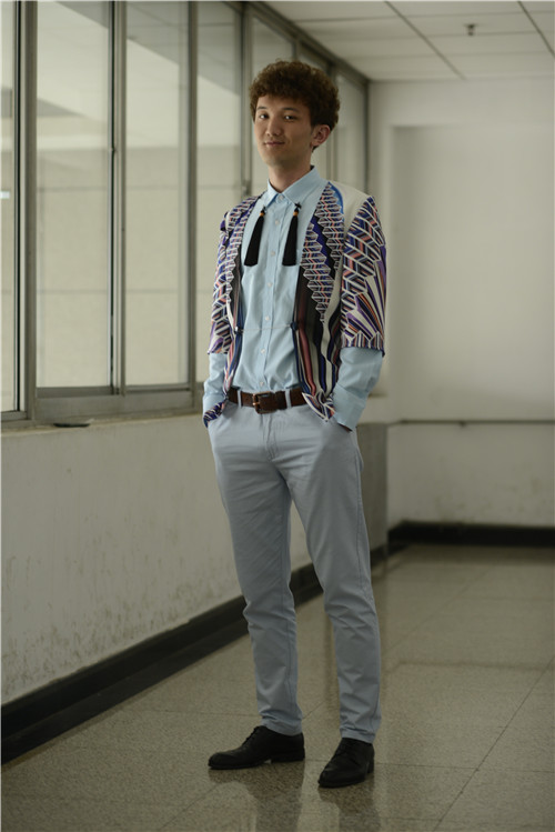 在群秀的环节中,历史学院为第三版块的第二个出场院系。模特们头敷金粉,冷艳出场,震撼全场。女模特口衔凤凰雕饰,男模特多背金色小包。服饰以蓝紫条纹衫为主打,寓意华夏古典纹章;以金色饰物为点缀,象征凤凰正统,高度契合了“九霄环佩,凤吟神州”的主旨。历史学院的服饰设计独具特色,时尚实用感极强,走强势白领风; 剪裁优雅利落,简而不约,低调中彰显奢华。历史不仅专于过去,更能知于当下,走秀结尾,萌萌的“大白”上场,为这场走秀融入了最新的流行元素,也带动了一次全场的高潮。在之前院系或妖异或梦幻的衬托下,历史学院的服饰如一阵凌厉的风,得到一致好评。历史学院模特们向全场完美展示了历史学院基于传统,与时俱进,古典与时尚相结合的学院风格。