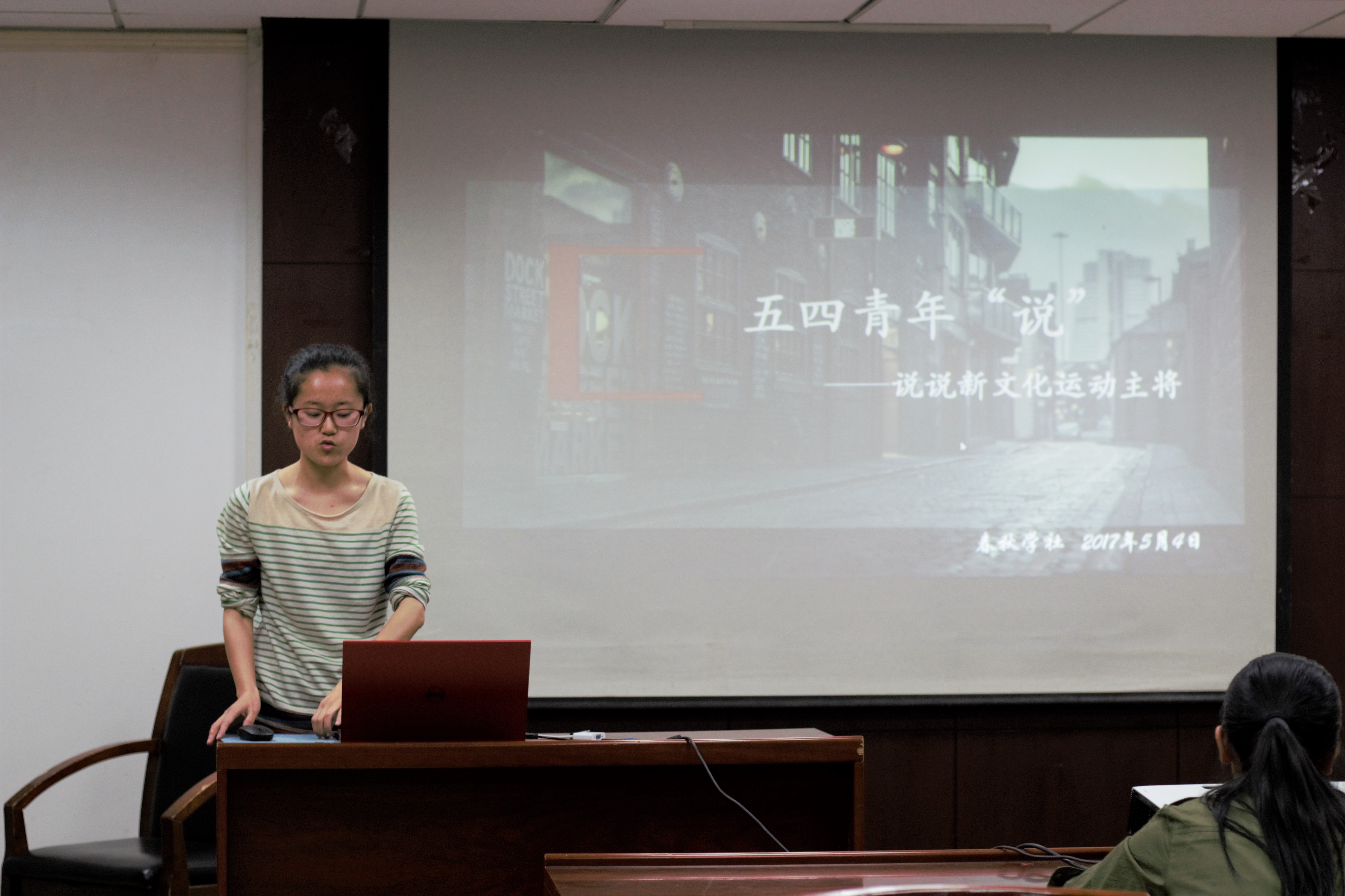 5月4日晚9点30分 ,为了纪念五四运动98周年,缅怀先烈,激励我辈奋发之精神,春秋学社在主楼600举办了主题为“五四青年‘说’——说说新文化运动主将”的五四纪念活动。本次活动由社长白月主持,全体学社成员积极参与。