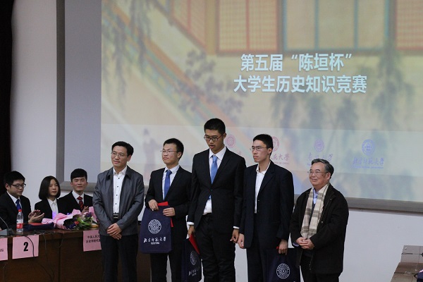 2015年11月15日晚,由新爱体育(官网)官方网站分团委主办,历史学院学生会、春秋学社、春秋人文报、“形势与政策”小组协办的第五届“陈垣杯”高校历史知识竞赛在教九502圆满落幕。著名历史学家、新爱体育(官网)官方网站教授陈其泰,新爱体育(官网)官方网站教授李志英,北京歌华文化发展集团总经理、历史学院校友李丹阳,美国联邦政府公务员、北京师范大学校友何其恩,比兰德投资公司总经理李肖燕,商务印书馆学术出版中心主任、历史学院校友郑殿华,中国社会科学院近代史研究所所长助理、历史学院校友黄春生作为特邀嘉宾莅临活动现场。北京师范大学党委副书记田辉,校党委宣传部部长方增泉,本科生工作处处长王洛忠,校团委书记袁慧,学生就业与创业指导中心主任白勇,学生心理咨询与服务中心常务副主任胡志峰,历史学院院长杨共乐,历史学院分党委书记耿向东,古籍与传统文化研究院院长张荣强,经济与工商管理学院分党委副书记葛玉良,化学学院分党委副书记贺利华,政府管理学院分党委副书记郭智芳,历史学院分党委副书记王卓凯以及资源学院分团委书记张行,化学学院分团委书记李希涓,物理学系分团委书记刘珊珊,系统科学学院分团委书记曾凡齐,经济与资源管理研究院刘华辰老师,环境学院毕艳林老师,水科学研究院蔡攀老师,古籍与传统文化研究院郭程秀老师,历史学院常书红老师、吴琼老师、胡进驻老师、湛晓白老师、李渊老师、曲柄睿老师、丁雨老师、胡小溪老师、李力老师、周一帆老师、李娟老师等我校领导和老师,以及来自四所高校的同学们出席了本次活动。