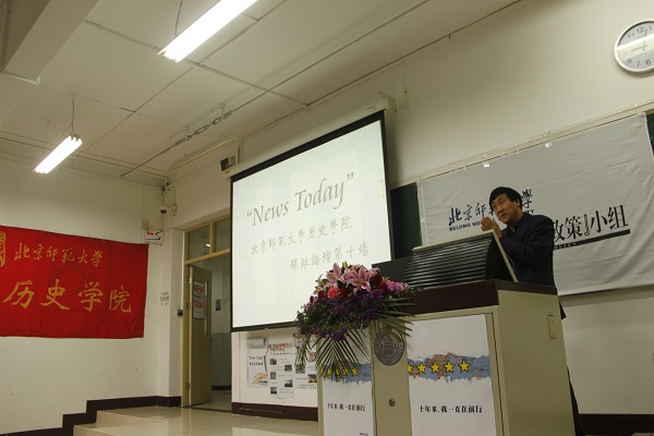 2015年12月19日晚8时,“News Today”新爱体育(官网)官方网站环球论坛第十场在教二101 隆重举行。北京师范大学本科生工作处处长王洛忠教授,历史学院院长杨共乐教授,历史学院世界近代史教研室主任郭家宏教授,世界近代史教研室陈奉林教授、贾珺副教授,历史学院分党委副书记王卓凯老师,教育部高校辅导员培训和研修基地田震老师,历史学院分团委书记胡小溪老师,2015级本科生班主任湛晓白老师,2015级硕士生班主任曲柄睿老师,文学院专职辅导员熊艺钧老师,历史学院专职辅导员李力老师,学生事务助理周一帆老师等嘉宾莅临现场。中国国际广播电台原副总编辑、高级编辑、北京大学客座教授、中东问题专家马为公先生作为特邀嘉宾出席本次活动。