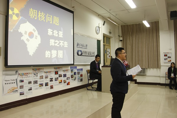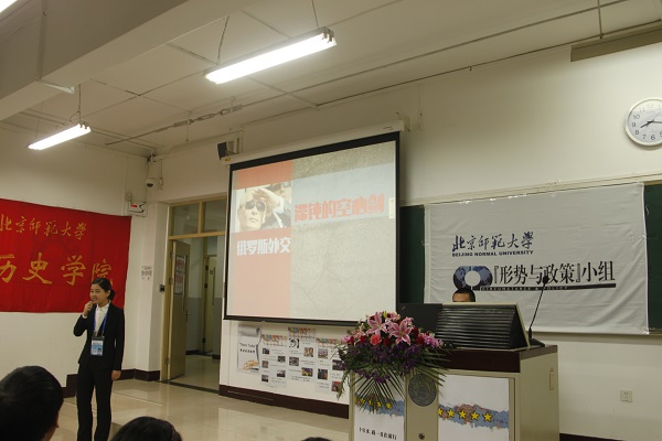 第一组代表张颖同学以“俄罗斯外交——滞钝的空心剑”为题,以俄罗斯近日对土耳其击落军机的全面反制和去年对待乌克兰问题的强硬态度为切入点,回顾了俄罗斯外交政策的发展历程,具体分析了普京政府强硬外交态度的国内外背景和形成原因,尖锐指出北约东扩等问题是影响俄罗斯外交政策的重要因素。第二组代表赵文博同学以“朝核问题——东北亚挥之不去的梦魇”为题,以2015年伊朗核问题谈判取得重大进展为切入点,在对目前有核国家核力量进行详细对比后,指出朝核问题是当今世界核安全问题的突出表现,进而具体分析了朝核问题产生的原因和现状,并提出了全面、持久解决朝核问题的几点构想。第三组代表国际关系学院朱天宇等同学以“中国与欧盟关系变迁”为题,回顾了40年来中欧关系的发展历史,并对近年来的欧债危机、难民危机和美欧“TTIP”谈判等关键问题进行了深入探讨,指出影响中欧关系的主要因素在于世界各极力量的博弈与消长。第四组代表刘畅同学以“黑旗升起的十年——‘伊斯兰国’的前世今生”为题,回顾了伊斯兰国的发展历史,控诉了其残暴罪行,具体分析了伊斯兰国发展壮大的历史和现实因素,最后指出各国政府要加强反恐合作,发挥国际组织的作用,在全球范围内反对霸权主义和强权政治,建立更为公正合理的国际政治经济新秩序。各组展示内容丰富、形式灵活,主讲语言生动、感染力强,赢得了现场观众的阵阵掌声。