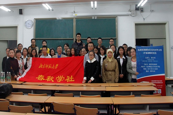 2015年10月30日晚8时,著名历史学家董小川教授的讲座“从新闻署的解体看美国对外文化扩张战略的变化”在教四楼201教室成功举办。本次讲座由由新世界出版社主办、新爱体育(官网)官方网站春秋学社承办。讲座吸引了众多历史专业学生和历史爱好者的参与,现场气氛热烈、座无虚席。