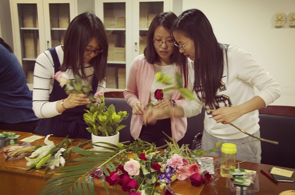 最后的插花环节将活动推向了高潮。在场同学们分为六组,每个小组通力协作,将一朵朵美丽的鲜花变成了一道道亮丽的风景。“不浪费”“花杂”“怎么那么美”“淡妆浓抹总相宜”“在水一方”“还没想好”一盆盆姿态各异的作品对应了一个个各具特色的名字。大家在创作中各显其能,一同感受美、创造美、欣赏美。
