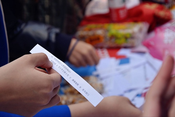 本次活动共设置了五等奖项,每个奖项都对应一份美观实用的小礼物。参与活动的同学可以获得相应的印章,并凭印章在领奖台兑换奖品。活动期间,22个学院共分为9个各具特色的专区,各专区前人头攒动,现场气氛热闹非凡。其中,由我院和数学科学学院共同组织的动漫专区吸引了众多动漫迷前来挑战,电视剧、电影等专区由于与同学们的娱乐生活相贴近赢得了最多的关注,旅游、美食等专区以中外文化为背景,星座、综艺、音乐等专区则主打流行元素。本次活动于下午1时30分结束。