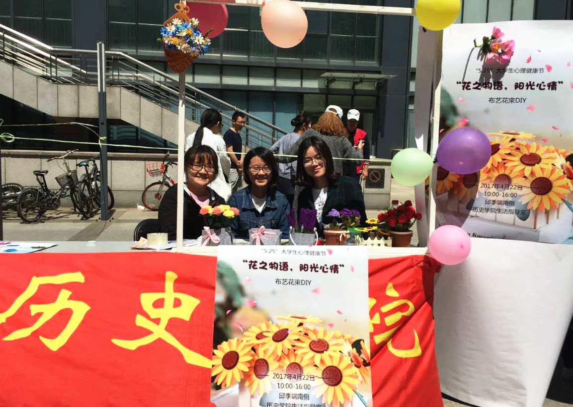 2017年4月22日上午,北京师范大学“5·25”大学生心理健康节正式拉开帷幕。历史学院生活指导室开展了“花之物语,阳光心情”布艺花束DIY的外场活动,旨在体验手工制作的乐趣,以花传情,展现青春的活动,传达阳光的心态。