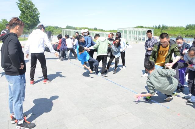 在活动开始正式开始之前,同学们在四位教练的带领下进行热身活动并分组,小组内协作设计好本组的组徽、组名与口号并进行展示。第一项活动为“坐地起身”,要求两人背对背坐下后不用手站起身,随后依次增加人数,直至小组内成员全部参与其中。这项活动,需要小组内成员的积极配合以及坚持不懈的精神,才能取得最后的成功。虽然有的小组在活动中有失误,但依然坚持完成了任务。第二项活动为“猴子捞月”,要求同学们站在线外以各种方式拿到果冻,身体不能接触到线以内的区域。这一环节不仅可以培养团队之间的默契与分配能力,同时也可以锻炼大家的身体素质与肢体协调能力。各组成员都拼尽全力,运用各种策略完成了这一任务。第三项活动为“盲人方阵”,这一环节体现的是团队队员之间的配合和信任。一个有领导、有配合、有能动性的队伍才能称之为团队,本游戏主要锻炼大家的团队合作能力。在进行素质拓展的过程中,两个学院(部)的成员们全心投入活动,积极参与,在愉快的氛围之中合作、竞争。