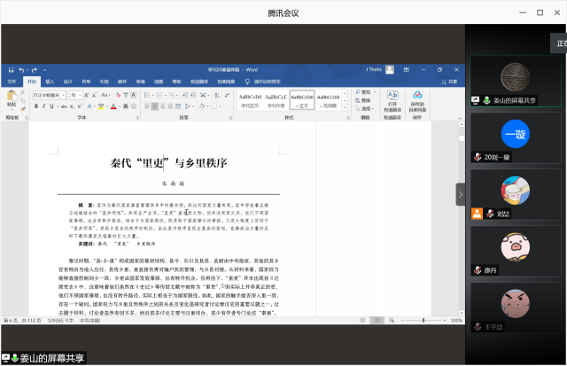 首先,姜山同学通过范例操作向同学们讲解了论文排版的版式和字体、文章信息、正文、脚注、编辑技巧这五个方面的技术性内容。她以2020年《春秋学刊(春季)》中的文章——《秦代“里吏”与乡里秩序》为例,从版型编辑讲起,结合自身经验,突出强调了学刊编辑过程中存在的一些易错易混问题,例如正文字体一定要使用方正新书宋体而非普通宋体等,并细致地介绍了操作中要注意的行距单位、快捷操作和常用模板等,让同学们真实的体验到了《春秋学刊》的编辑修改过程,意识到细心严谨的重要性。她还强调了学刊编辑对于排版的特殊要求,分享了自己在论文写作中的经验,这些都帮助同学们对论文写作有了更为清晰的了解。