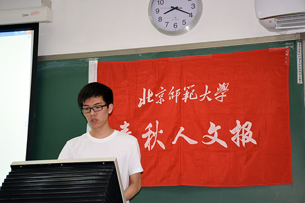 晚8时许,总结会正式开始。首先由第十一届编委会主编钟明浩对本年度报社工作进行总结汇报。他从组织结构、社团活动、品牌活动和社团建设四个方面出发,同时结合年度大事记带领大家回顾了人文报一年来走过的道路和取得的成绩。2015至2016年度,《春秋人文报》报社中层与大一干事们共同努力,出色地完成了第82至85期报纸的发行工作,同时在新媒体运营方面取得了突破性进展,还成功举办了第二届“首都高校大学生家史征文大赛”、“拾忆·故园”老照片征集活动等优质品牌活动,成果斐然。报社还社团内部的组织、活动、建设等方面加以创新,使社团运行更加顺畅,新生力量得到更好的培养和锻炼。