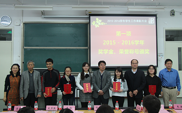 大会首先由姜海军老师宣读2015-2016学年本科生国家奖学金、国家励志奖学金、京师奖学金、专项奖学金、社会奖学金以及三好学生等荣誉称号获得者名单;李帆老师宣读2015-2016学年研究生国家奖学金、学业奖学金、专项奖学金、社会奖学金等荣誉称号获得者名单。随后进行大会第二项,郭家宏老师宣读白寿彝史学论著奖本科生组获奖名单。大会第三项流程是2016年度学生工作颁奖,在播放历史学院2015-2016学年学生工作回顾展示视频后,王卓凯老师宣读了各项国家级、市级及校院两级学生工作教师、集体类奖项获奖名单;湛晓白老师和朱敏老师分别宣读了校级和学院学生工作获奖学生名单。院长杨共乐老师、副院长李帆老师、副院长姜海军老师、分党委副书记王卓凯老师、世界近代史教研室主任郭家宏老师为获奖代表颁奖,并与获奖代表合影留念。