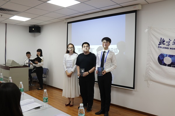 在授牌和颁奖环节,第十二届“形势与政策”小组秘书长陈雁为新晋组员和院系联络员颁发胸牌。本学期内,徐源辰、卢元齐、余可绎参加2019年首都高校新生时事知识友谊赛并获得冠军,高超、孟子煜、邢晓坤、李才林参加第十五届“和合生•共命运”首都高校外交之星风采大赛并获得季军,赵文博、洪思音、唐洪超参加第八届京津高校国际关系史竞赛并获得亚军,赵文博还获得最佳风采奖。牛小游老师为上述同学颁发了纪念光盘。徐源辰同学宣读了小组年度获奖名单和颁奖词,胥晨曦老师为获奖同学逐一颁发证书并合影留念。生动活泼的颁奖词、风趣的奖项名称与每位获奖同学的特质相吻合,让大家在欢快的气氛中回忆起令人感动的一幕幕场景。秦雅婕同学为“形势与政策”小组2015级毕业成员代表颁发纪念徽章。