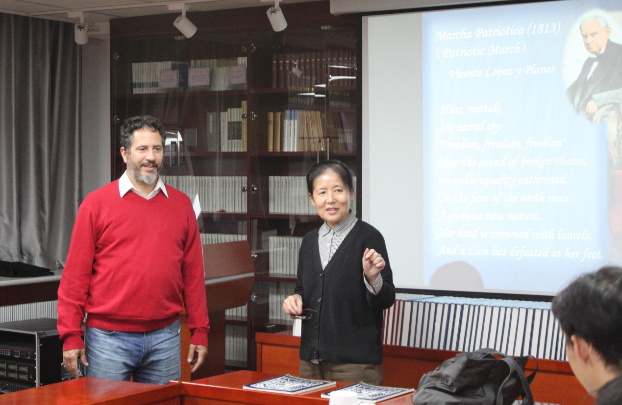 罗新慧老师致欢迎辞。她表示,毕嘉宏教授长期在中国居住学习,曾多次应邀前来新爱体育(官网)官方网站访学,与我院师生始终保持着紧密友好的交流关系。希望同学们成员珍惜宝贵机会,开阔国际视野,进一步了解阿根廷历史文化,增进对新形势下中阿关系、中拉关系的认识。