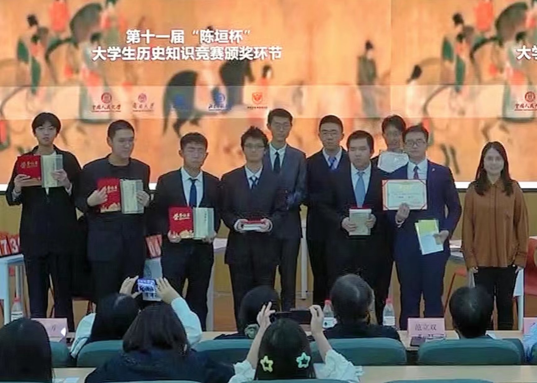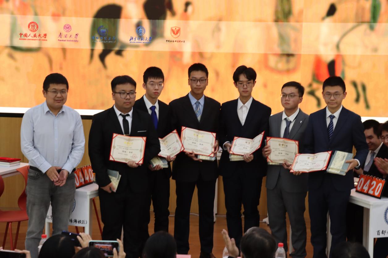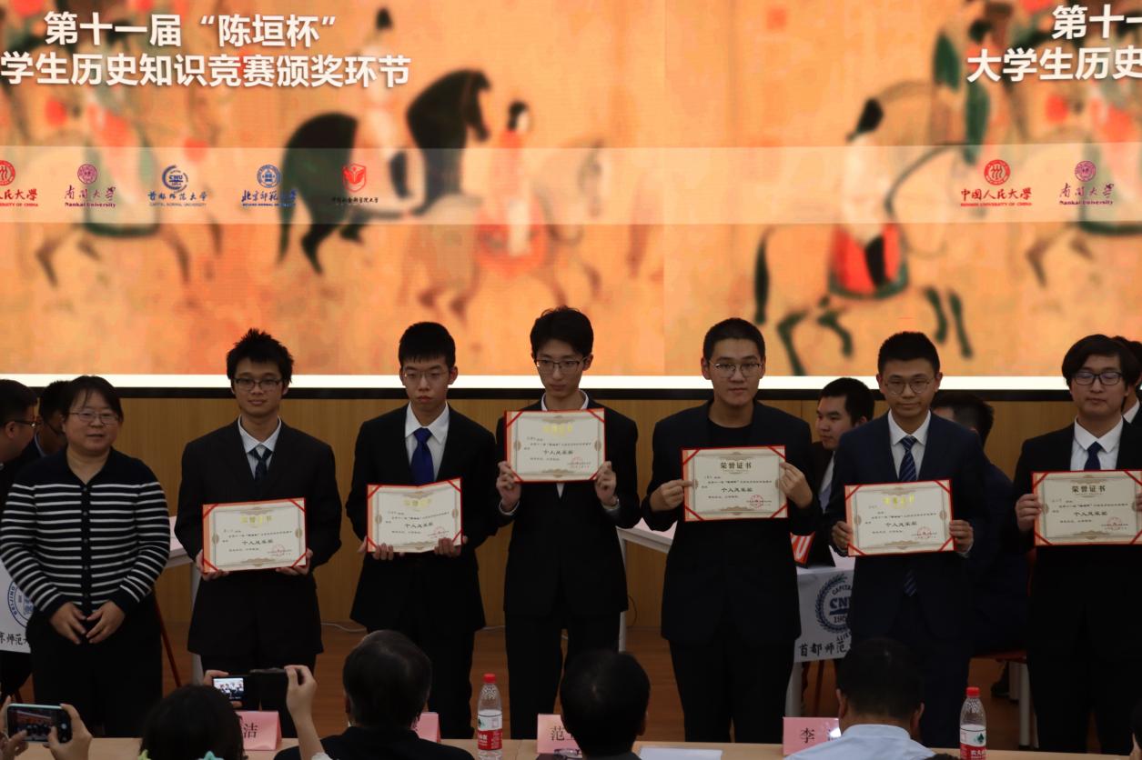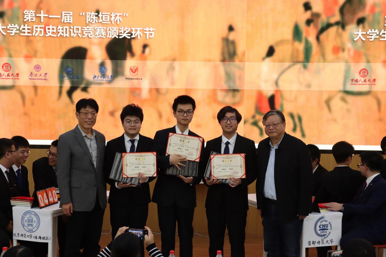 经过选手们激烈的角逐,首都师范大学代表队、中国社会科学院大学代表队和中国人民大学代表队获得三等奖;北京师范大学珠海校区代表队和南开大学代表队获得二等奖;北京师范大学北京校区代表队拔得头筹,赢得冠军。同时,六名同学凭借扎实的历史知识和机敏的临场反应脱颖而出,获得个人风采奖。比赛最后,嘉宾老师为参赛选手颁发了获奖证书和奖品。