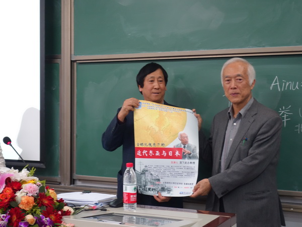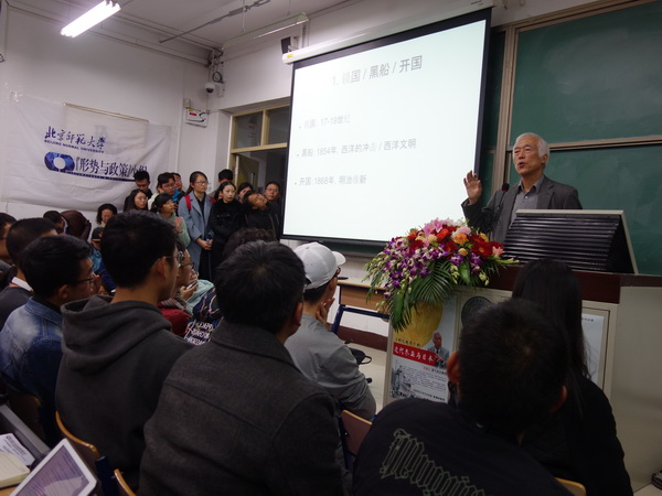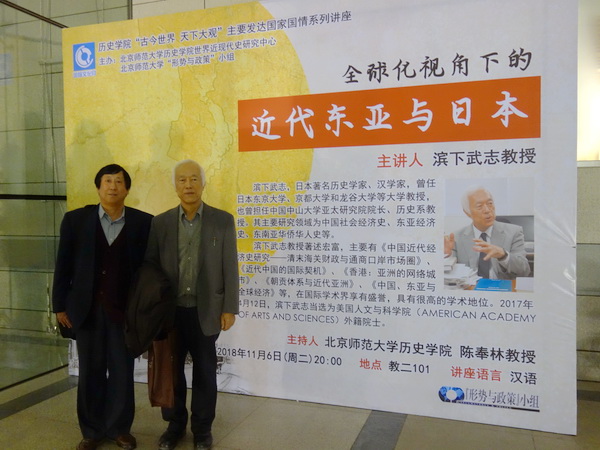 2018年11月6日晚,日本著名历史学家滨下武志教授应邀来到北京师范大学,在教二101教室作以“全球化视角下的近代东亚与日本”为主题的专题学术讲座。此次讲座系历史学院“古今世界,天下大观——主要发达国家国情系列讲座”的第十二讲,标志着历史学院2018年“国际文化月”正式拉开帷幕。讲座由历史学院世界近现代史研究中心、“形势与政策”小组共同主办。我院陈奉林教授担任讲座主持人。中国社会科院近代史研究所高士华研究员,我院中国近代史教研室张昭军教授、贾琳老师等出席了讲座。本次讲座恰逢“形势与政策”小组第100次集体学习,也吸引了众多高校学生与历史爱好者前来聆听,现场座无虚席,盛况空前。